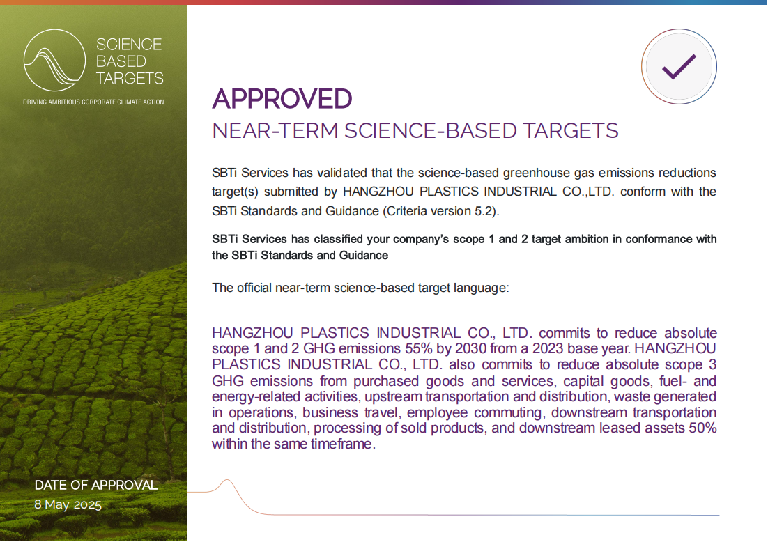 2025年05月10日,米兰官方网页版(以下简称“杭塑”)正式宣布,公司提交的截止到2030年减碳目标已通过国际权威机构“科学碳目标倡议”(Science Based Targets initiative, SBTi)的全面审核认证。此举标志着杭塑的碳中和路径与国际温控1.5℃目标进一步对齐,为行业绿色转型树立科学实践标杆。